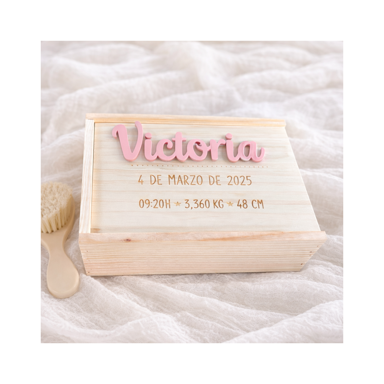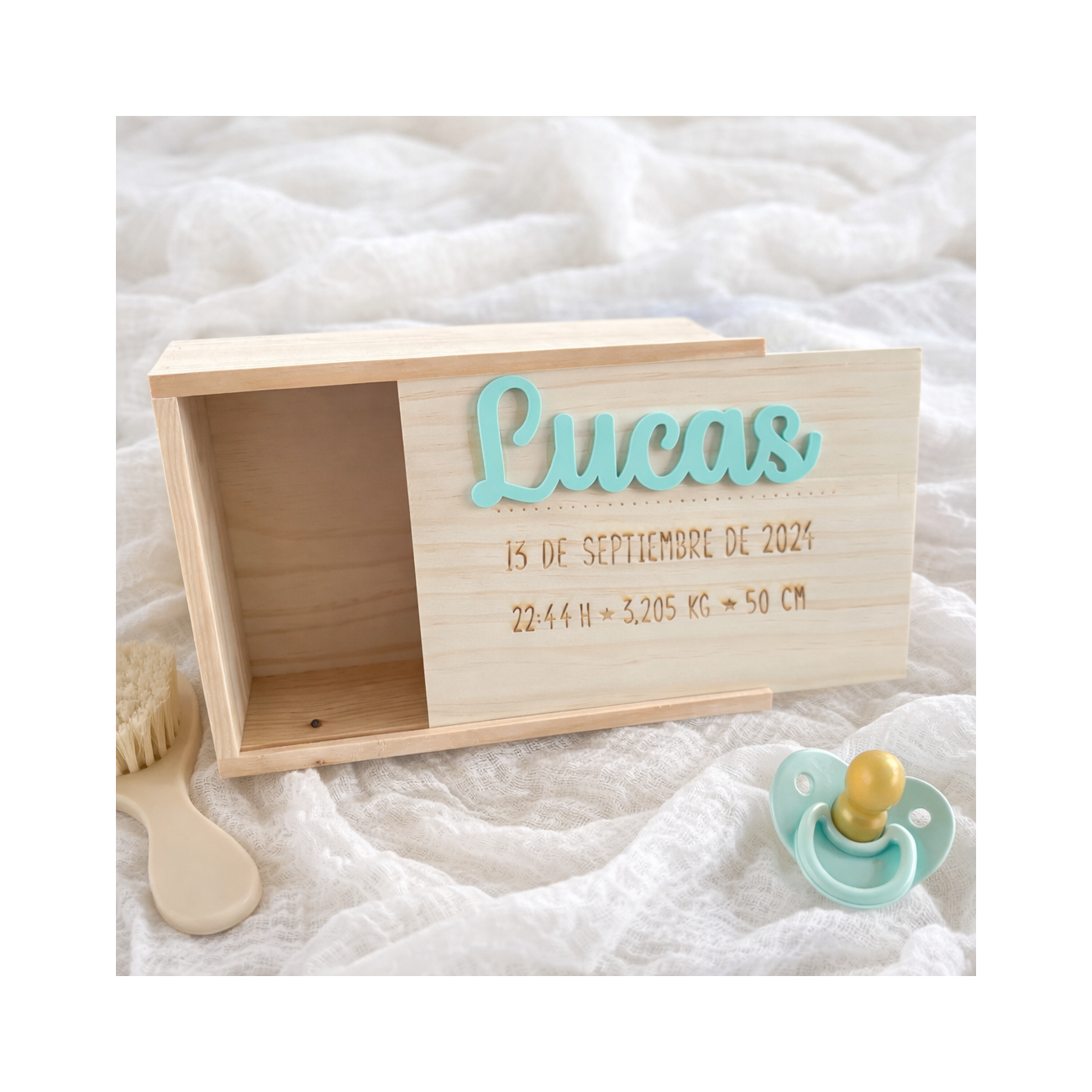Nuestra cajita de nacimiento personalizada en madera natural, perfecta para guardar los primeros recuerdos del bebé: chupete, pulserita del hospital, primeras fotos, mechón de pelo… un tesoro para toda la vida.