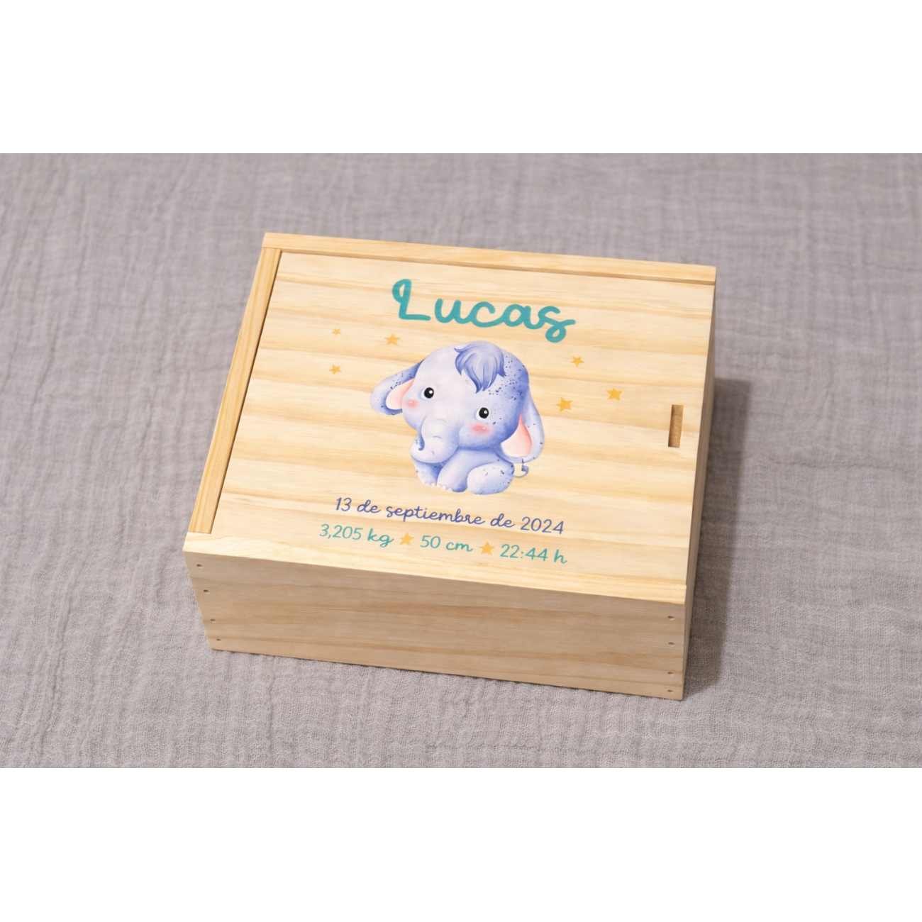 Nuestra cajita de nacimiento personalizada en madera natural, perfecta para guardar los primeros recuerdos del bebé: chupete, pulserita del hospital, primeras fotos, mechón de pelo… un tesoro para toda la vida.