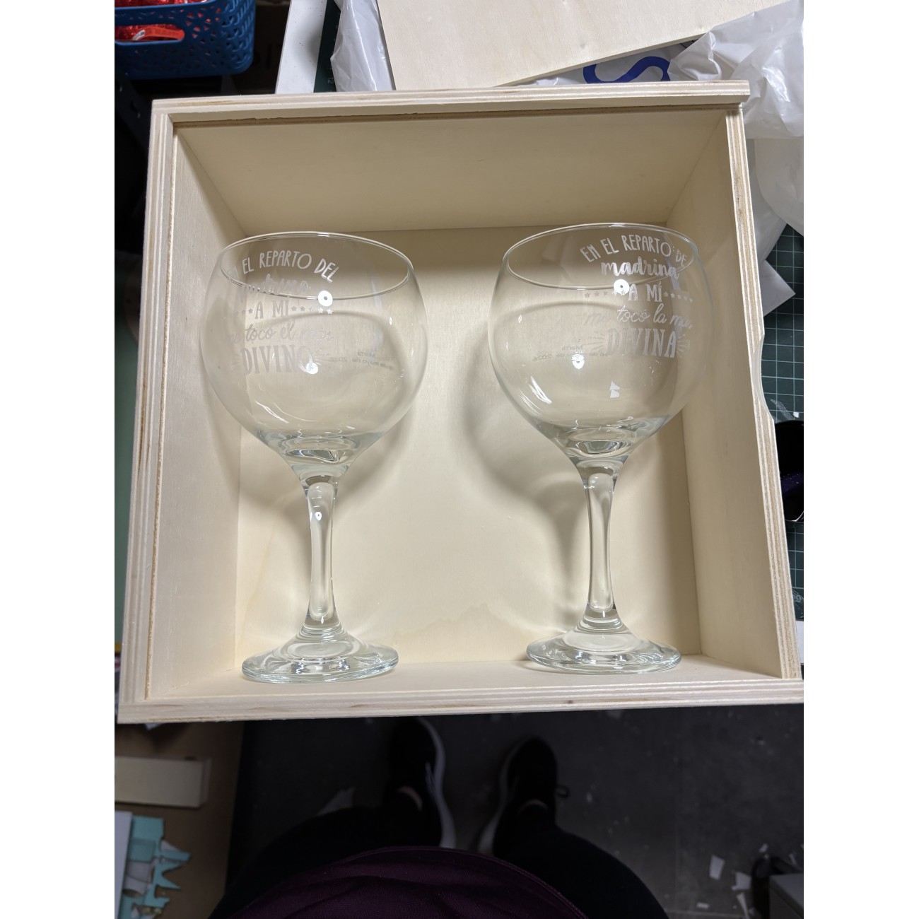 También puedes comprar la cajita de madera para personalizar igual que las copas, quedan ideales dentro.