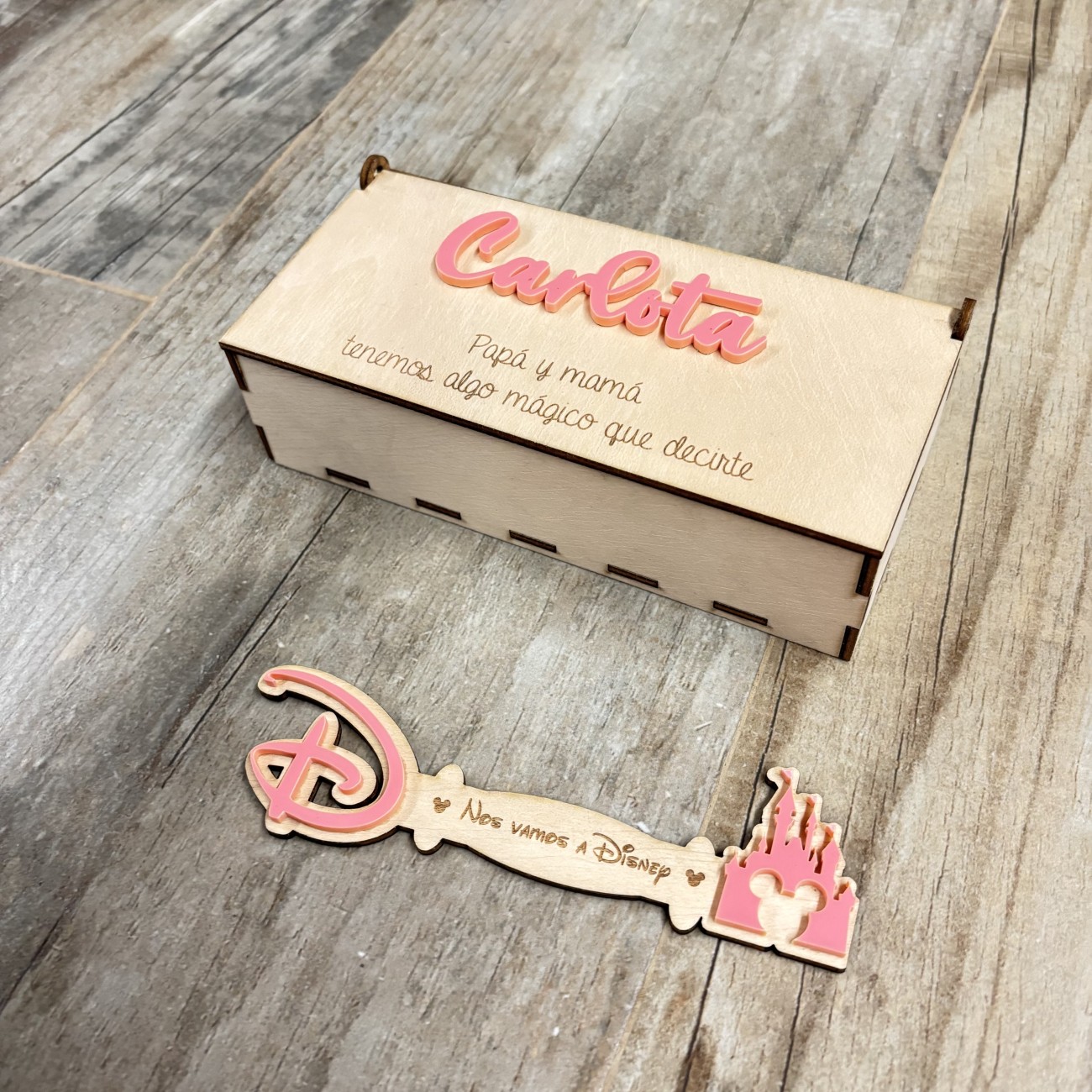 La llave de madera personalizada es la forma más especial de regalar un viaje a Disneyland Paris, creando emoción desde el primer instante.