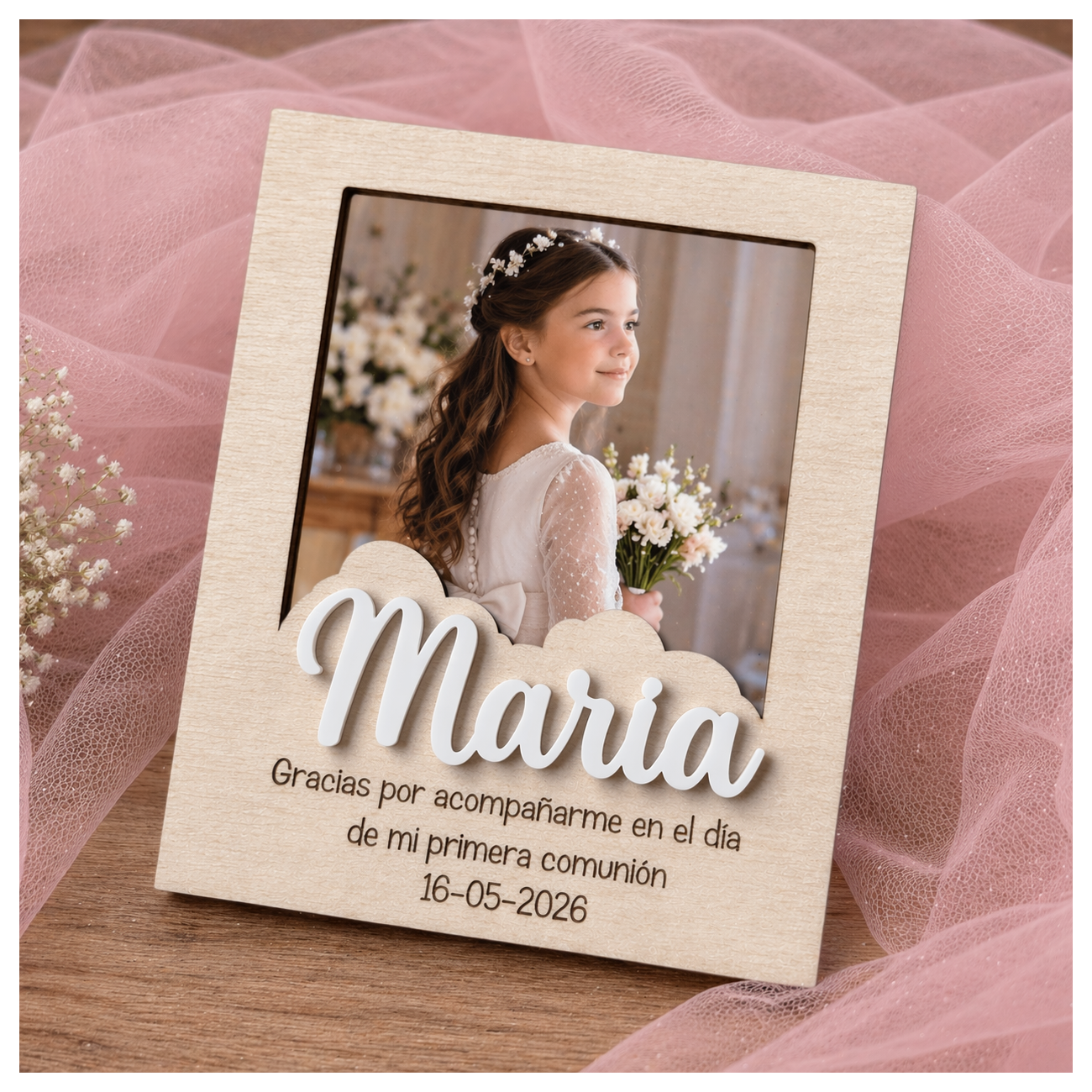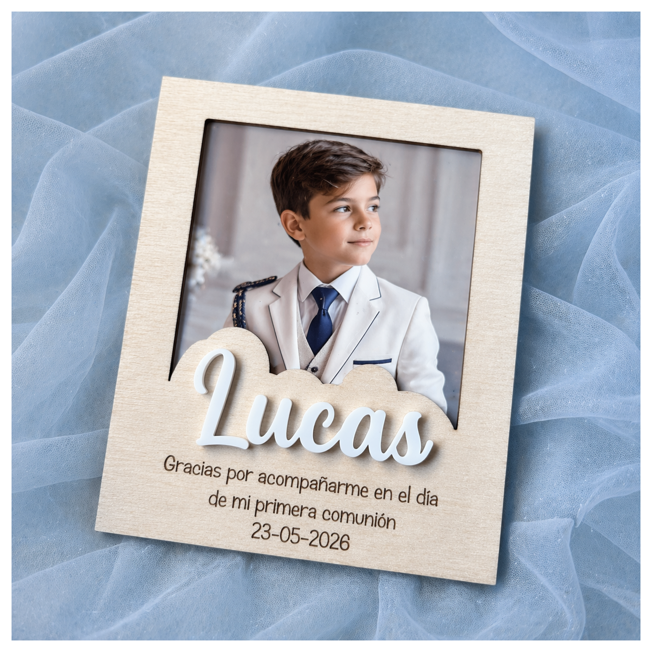 Sorprende con un detalle único y especial en comuniones, bautizos o cumpleaños. Este marco imán de madera de 3 mm está personalizado con nombre en metacrilato (color a elegir), convirtiéndose en un recuerdo bonito y duradero para tus invitados.