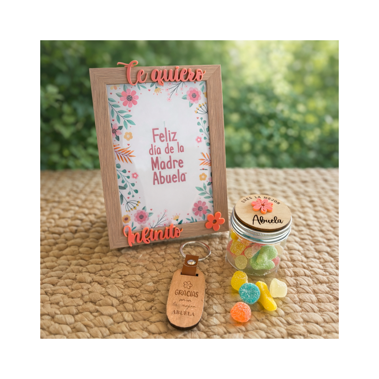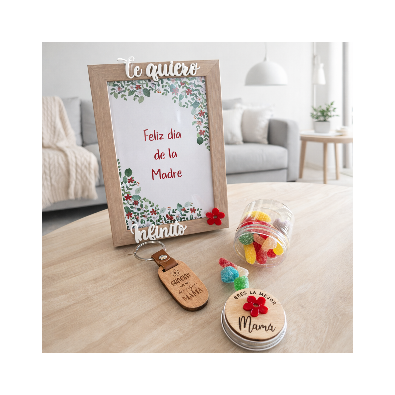 Pack regalo compuesto por marco de fotos, cajita de chuches con tapa de madera y llavero de cuero/madera, el detalle perfecto para sorprender a Mamá o Abuela en su día.
