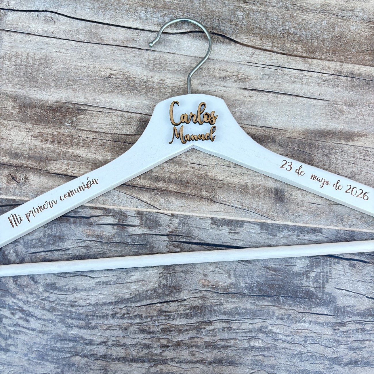 Perchas de madera personalizadas, ideales para colgar el traje o vestido de Primera Comunión y crear un recuerdo especial de un día único.